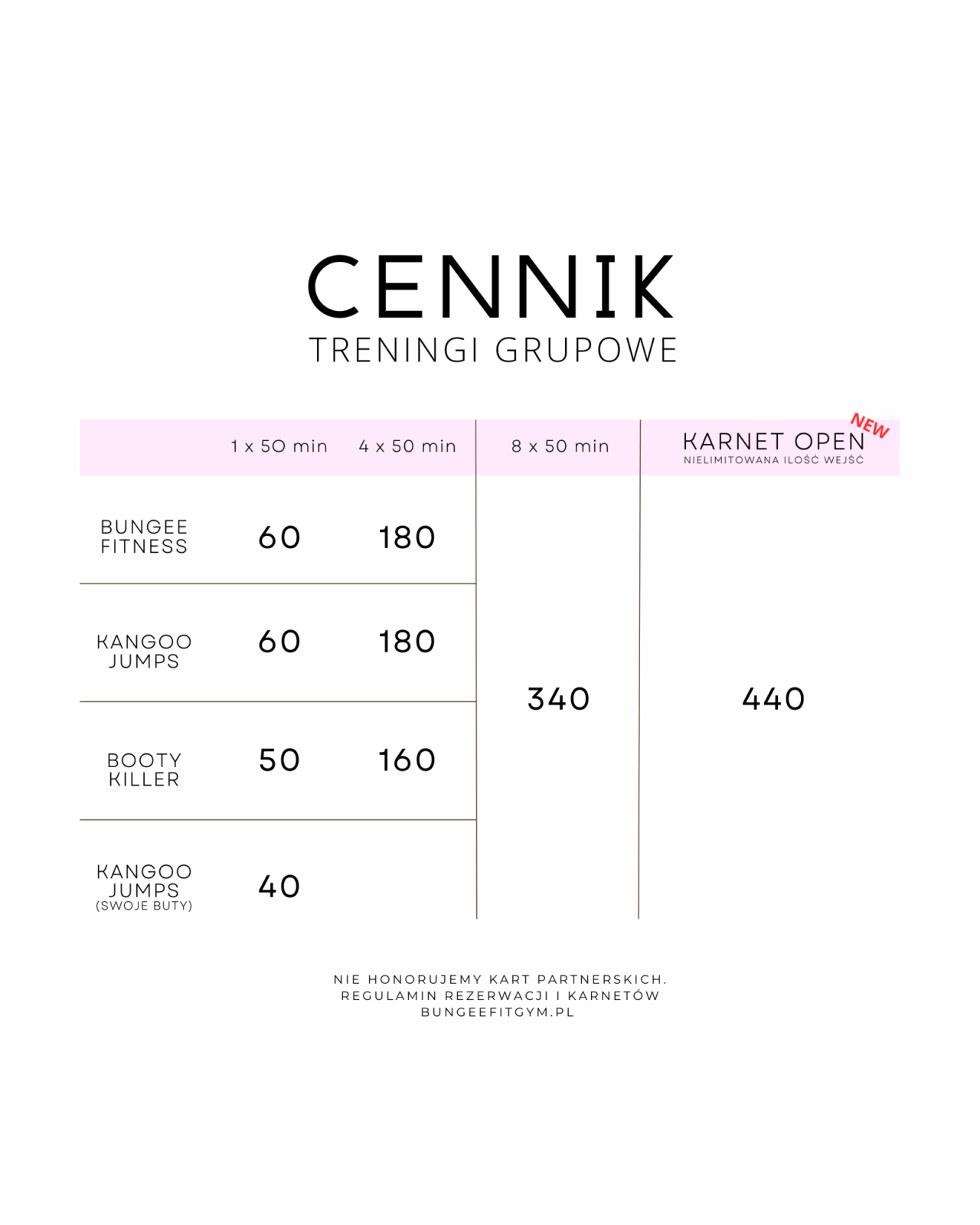 - Karnet można kupić bezpośrednio u prowadzącej po skończonym treningu. Wtedy następuje dopłata różnicy wartości pełnego karnetu (60 zł zadatek + 100 zł dopłata = 160 zł karnet bungee)